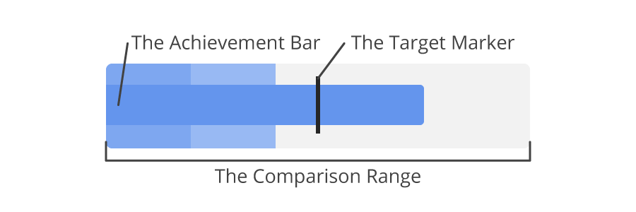 - The Achievement Bar: this component has been designed to represent the actual value of the chart. This is real data that maps to the quantitative scale. When creating this bar, it is important that you give it a solid color while also making it more narrow. This is typically rendered as a black bar.