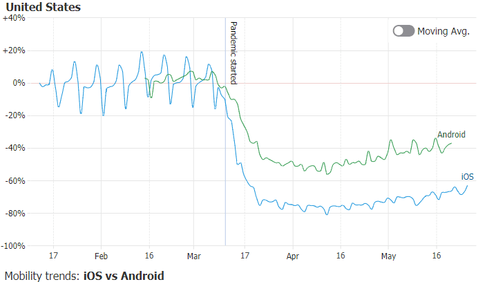 These datasets also offer a small, yet imperfect, insight into the relative differences between iOS and Android users stringency to mobility measures throughout the world, by comparing Apple's Transit and Google's transit station statistics.