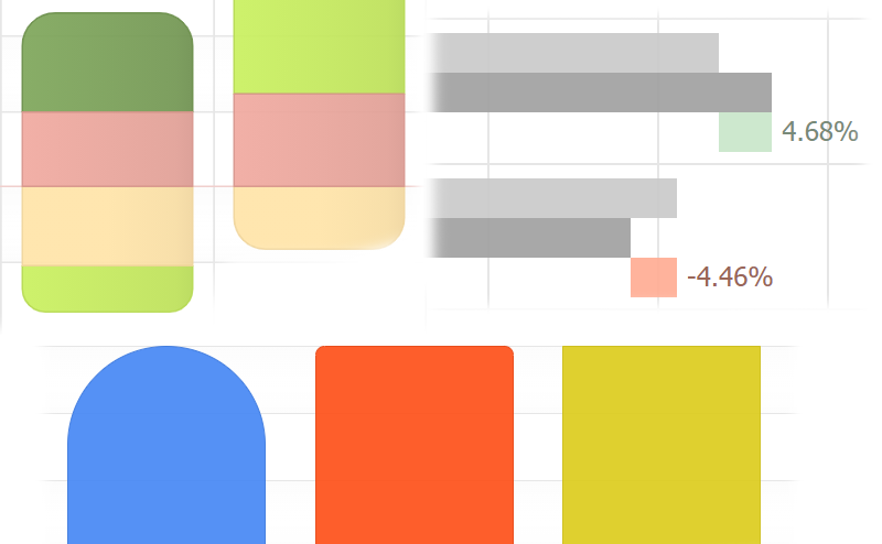 A major leap in aesthetics seamlessly maintained as your data changes, JSCharting will apply corner rounding to columns and bars at the appropriate edges automatically. No need to write code to avoid having notches between stacked items or any other problem scenarios. A visually pleasing corner radius is also automatically calculated to soften the column look regardless of size while being subtle enough not to interfere with reading specific chart values.