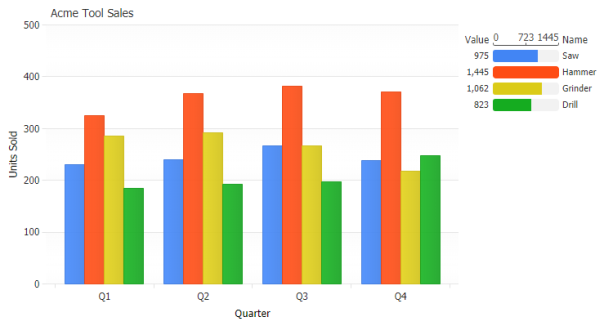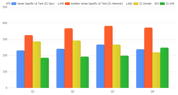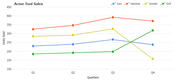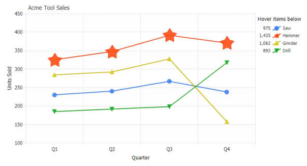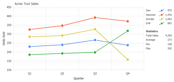 The legend can be positioned anywhere on the chart area and provides interactivity to turn individual series on or off. Using label tokens, legend entries can be easily customized to display general calculations related to their series.