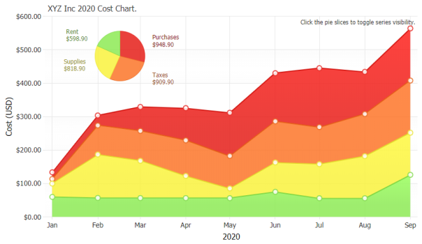 Uses a pie series as a legend that lets you toggle series visibility by clicking the pie slices.
