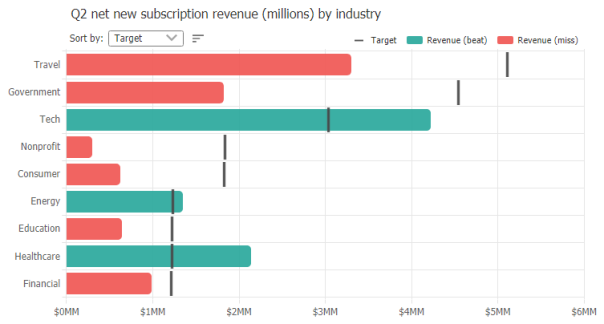 A bullet graph is a type of bar chart intended to replace dashboard progress bars and gauges. Compact and data dense, bullet charts provide value, target and category comparison ranges in a small data visualization.