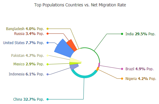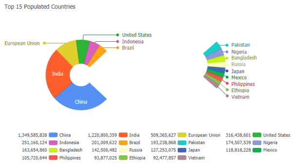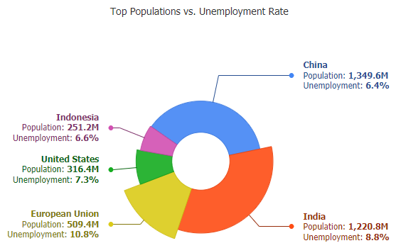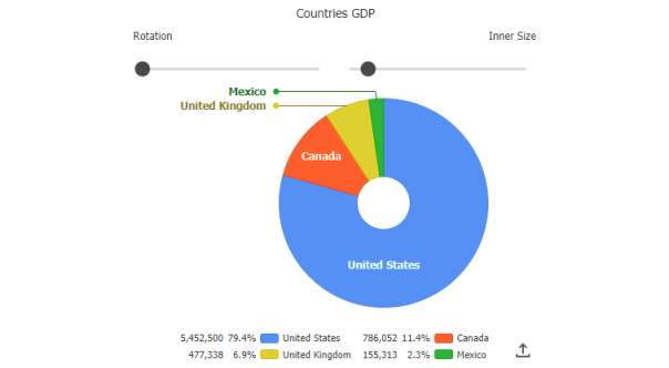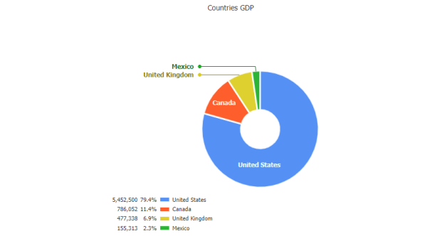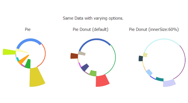 Donut charts offer proportional segmented values relative to the whole with a central cutout creating a lighter visualization. JSCharting supports advanced donut features including label callouts, tooltips and middle label support utilizing the internal donut space