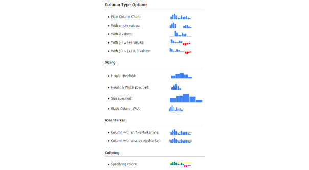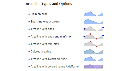 Micro charts and sparkline charts offer condensed data visualizations for many different chart types ideal for dashboard, table and grid chart integrations. Sparklines and micro charts typically disable axis and gridlines to aid smaller sizes charts for inline embedding.