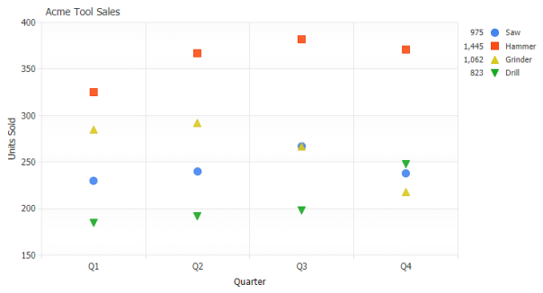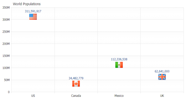Supporting a variety of predefined vector marker styles for point, scatter and line charts along with customization for size, color and hover effects, JSCharting also enables customization through your own image based markers on a per point basis.