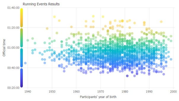 JavaScript scatter plot (also known as a scatter chart or scatter diagram) is a simple chart type that displays data points plotted using two values (x-axis and y-axis values define a given data point). Scatter plots are rendered with SVG and support advanced tooltips and data labels which display x values and y values with custom formatting options. Zooming and panning is built-in and demonstrated in the scatter chart examples below. When zooming, the JSCharting JavaScript library automatically animates transitions. Data is easily supplied from your own database, HTML or raw JSON. Plot trend lines, custom background-color, data point colors by series, axis markers, negative axis and much more with no CSS editing required. JSCharting provides the most comprehensive scatter charts plus highly tuned example charts with source code, so you can hit the ground running.