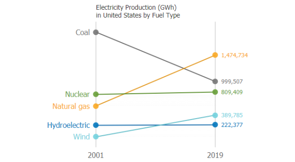 A slope chart is a simplified line chart that compares start and end point values. Slope graph charts are simple and compact data visualizations that enable you to view the change between points by the slope or steepness of the line between them.