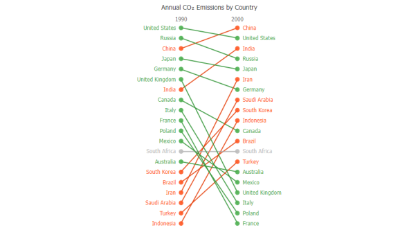 Slope chart that ranks items on both sides, uses 2-way dropdown selection, and first and last point labels.